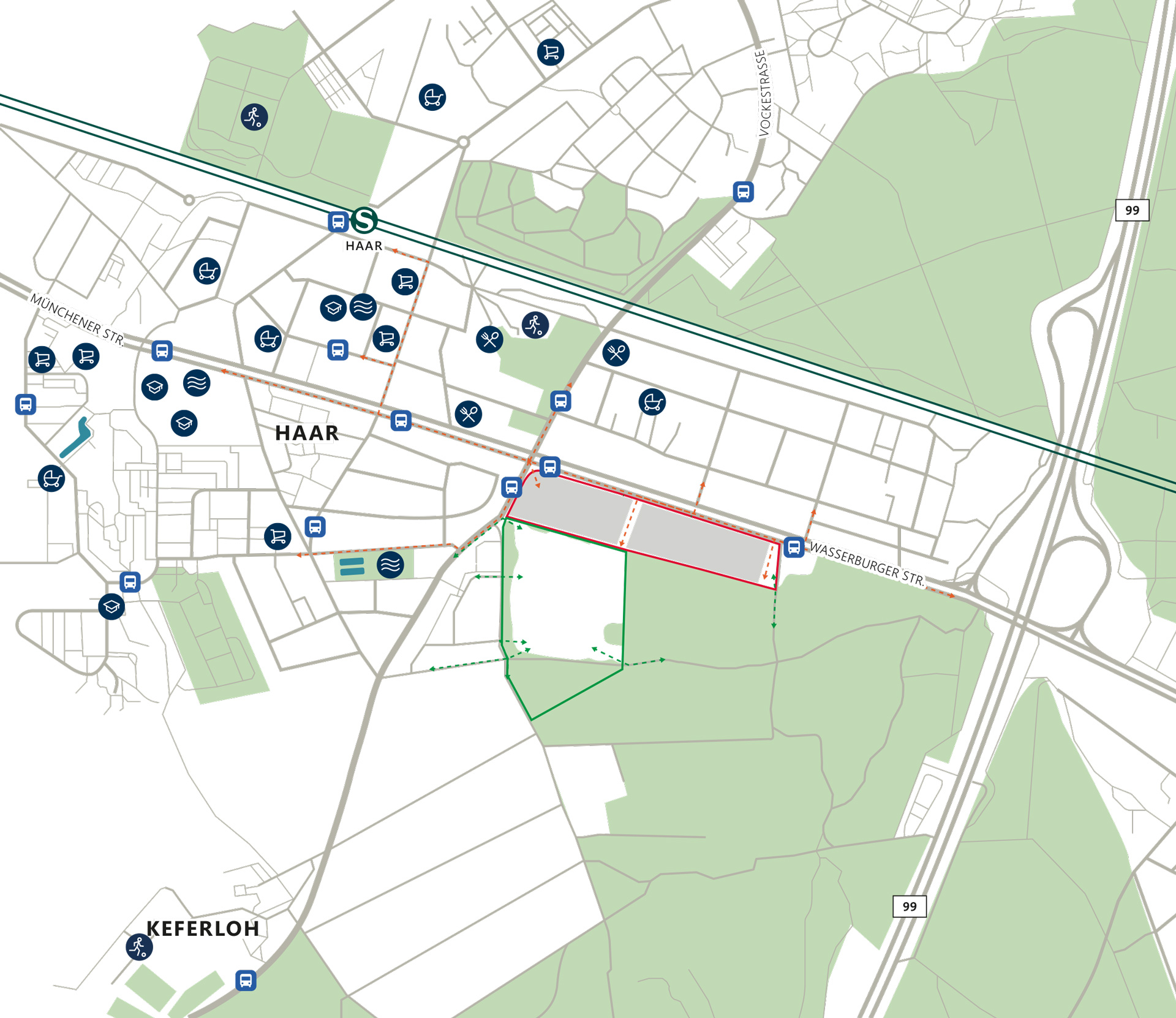 Das Gelände an der Wasserburger Straße befindet sich etwa 20 km von der Münchner Innenstadt entfernt in unmittelbarer Nähe zur Auffahrt auf die A 99. Eine Busstation sorgt für die direkte Verbindung zur S-Bahn-Station Haar, die in gut 15 min Fahrtzeit direkt mit dem Zentrum Münchens verbunden ist. Pendler wissen diesen Umstand besonders zu schätzen: Aktuell arbeiten bereits rund 7000 Münchner in Haar.